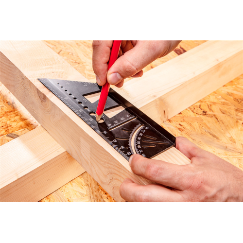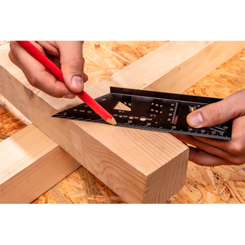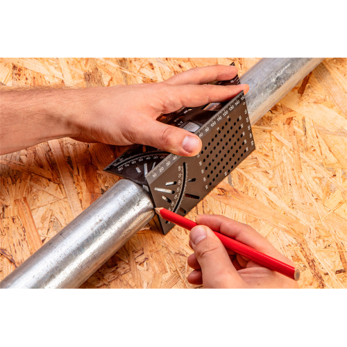 72-115 o wymiarach 72 x 155 x 215 x 62 mm jest wykonany z aluminium. Ułatwia on wykonanie pomiarów i przeniesienie ich na belki, rury lub inne materiały trójwymiarowe. Jego prostokątna geometria pozwala na wykonywanie dokładnych pomiarów w narożnikach. Idealny do dokładnego przenoszenia kątów ukośnych na dwie przylegające do siebie strony obrabianego materiału. Ograniczniki dla kątów 45° i 90° oraz kątomierz umożliwiają wykonanie dowolnego zadania. Przymiar narożny 3D może być stosowany jako znacznik stolarski do wykonywania linii równoległych. Umożliwia również określenie średnicy wiertła.