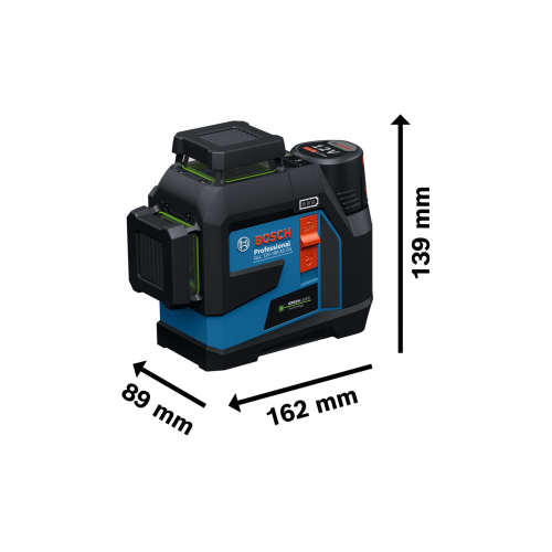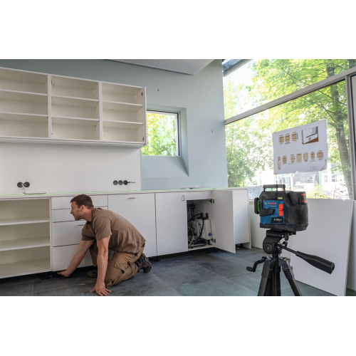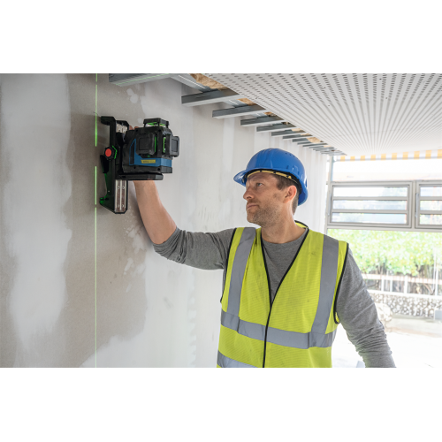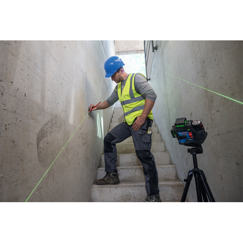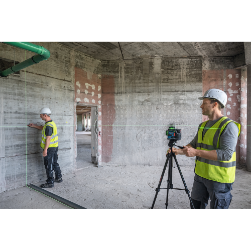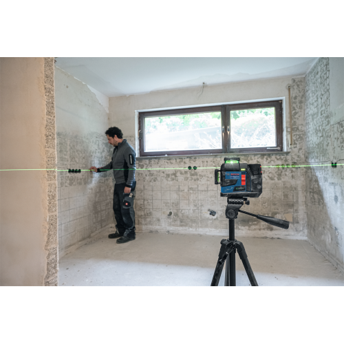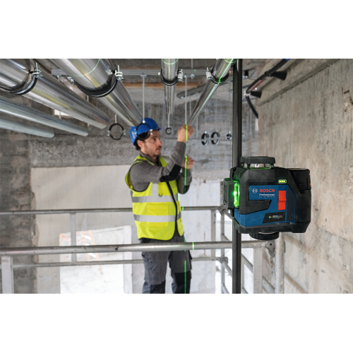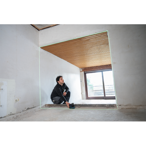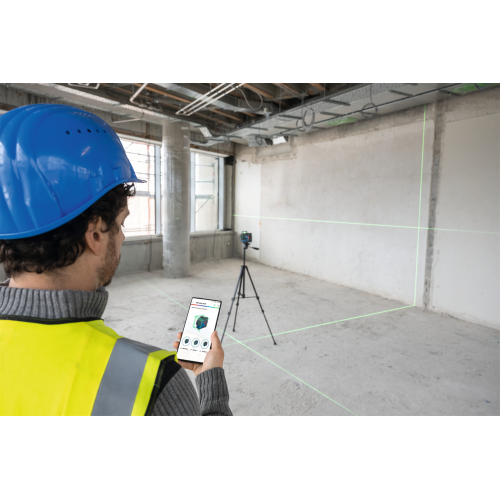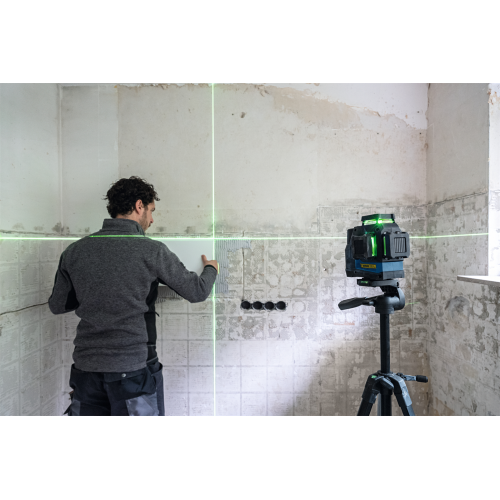 Model GLL 12V-100-33 CG wyświetla 3 zielone linie laserowe w zakresie 360 stopni, co pozwala pracować na kilku płaszczyznach jednocześnie. Urządzenie może być sterowane ręcznie przy pomocy przycisków znajdujących się na obudowie lub z użyciem aplikacji mobilnej Levelling Remote – dzięki obu opcjom łatwiej korzysta się z lasera w różnych sytuacjach.