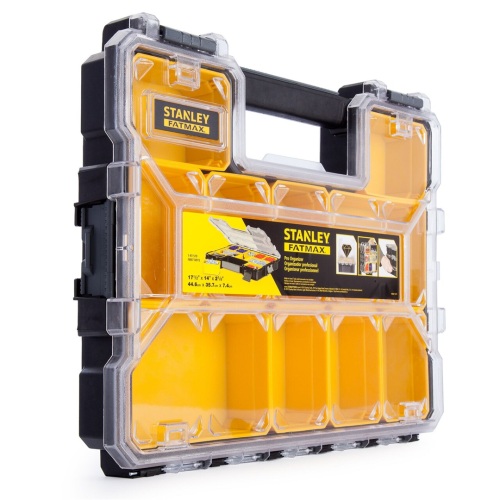 Organizer płytki FATMAX Stanley 1-97-519 posiada 10 ruchomych przegródek, dzięki którym użytkownik może wprowadzić ład i porządek w osprzęcie i innych mniejszych elementach. Dzięki unikalnej konstrukcji możliwe jest zamknięcie poszczególnych przegród. Zastosowanie mocnych, plastikowych zawiasów oraz silnego zamka zapobiega niezamierzonemu otwarciu się organizera. Rękojeść o odpowiednim kształcie zwiększa wygodę użytkowania. Modułowa konstrukcja sprawia, że użytkownik może spiąć kilka organizerów ze sobą, zapewniając sobie szybki dostęp do wielu elementów.