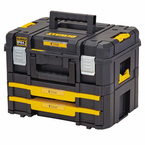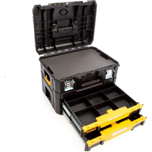 Skrzynia narzędziowa TSTAK DeWalt DWST83395-1 wyposażona została w wewnętrzną wkładkę z pianki, która chroni przenoszone elementy przed uszkodzeniami podczas transportu po trudnym terenie. Zastosowanie przednich i górnych uchwytów pozwala wygodnie przenosić skrzynię. Możliwość zamknięcia skrzyni na kłódkę pozwala dodatkowo zabezpieczyć przenoszone narzędzia i akcesoria. Dodatkowe wzmocnienie zatrzasków zwiększa bezpieczeństwo podczas przenoszenia, zapobiegając przypadkowemu otwarciu się skrzyni. Po bokach skrzyni znajdują się zatrzaski boczne z metalowym pinem, umożliwiające podłączenie dodatkowych modułów systemu TSTAK. Przegródki do szuflad są wyjmowane, pozwalając użytkownikowi na ich dowolne dostosowanie do swoich potrzeb. Skrzynia odporna jest na pył i wilgoć, co dodatkowo chroni przenoszone elementy.