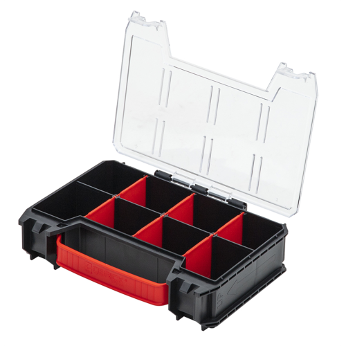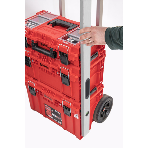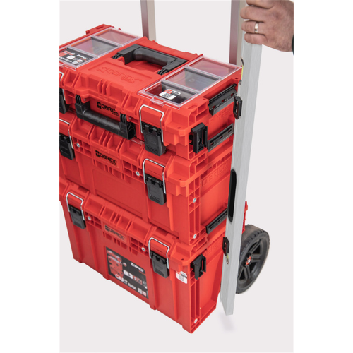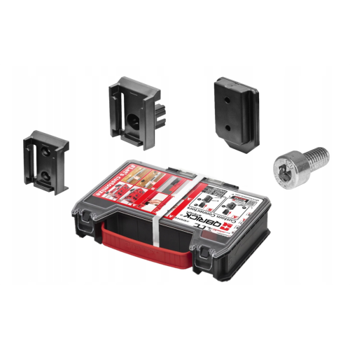 Organizer MULTI PRO Qbrick System ORGQPROMCZAPG001 wyposażony w komplet konektorów do customizacji to set Z258551PG0011 innowacyjnych akcesoriów do skrzyń narzędziowych systemu Qbrick ONE, PRIME i PRO. Korpusy skrzynek w wersjach 2.0 lub młodej linii PRIME zostały wyposażone w molety lub w tańszej wersji z tworzywa PP w miejsca na ów inserty. Te gwintowane otwory to punkt zaczepienia dla custom connector'a (cc) z jednym dużym otworem. W komplecie znajdują się dedykowane śruby fi 8mm na 16mm długości. W tak zamocowaną szybkozłączkę (cc1) można wsunąć jeden z 12 wypukłych elementów zestawu z dwoma otworami pod wkręty (cc3). Ten element można przymocować do narzędzia czy innego akcesorium fachowca. Łączenie cc1 z cc3 obywa się poprzez wsunięcie ich w siebie do momentu kliknięcia. Rozłączanie jest analogiczne - należy przełamać pierwszy opór zatrzasku i rozsunąć dopasowane do siebie elementy. Set zawiera również odpowiedniki cc1 przystosowane do mocowania na płaskich powierzchniach przy pomocy dwóch wkrętów. To bardzo uniwersalne rozwiązanie umożliwiające odwzorowanie mocowań ze skrzyń, np. w warsztacie czy na pace auta. Z racji możliwości mocowania do różnych materiałów jak drewno, blacha, metal, tworzywo lub mocowanie klejem, do zestawu nie są dołączane wkręty. Łączenie cc2 z cc3 odbywa się na tej samej zasadzie jak wcześniej. Tak więc produkt zawiera 12 kompletów custom connector'ów, z czego połowa jest do skrzyń, a połowa do umownego warsztatu stacjonarnego. Całość dostarczana jest w standardowym organizerze Multi z linii PRO, dzięki czemu nijako w gratisie zyskujemy praktyczny mały organizerek z przegrodami, kompatybilny z toolbox z linii PRO, PRIME oraz TWO, a także tanimi i popularnymi koszami TWO BOX 200.