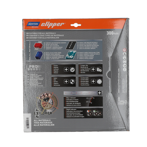Dzięki uniwersalnemu ostrzu, które skutecznie radzi sobie z betonem zbrojonym, betonem, płytkami oraz kamieniem naturalnym, użytkownik może cieszyć się szybkim i precyzyjnym cięciem. Dodatkowo, wysokość segmentu wynosząca do 12 mm zapewnia nie tylko większą liczbę cięć na tarczę, ale także wydłuża jej żywotność. Ponadto, segmenty w kształcie trapezu są kluczowe dla zapewnienia komfortu pracy – redukują one poziom wibracji oraz umożliwiają płynniejsze cięcie. Co więcej innowacyjność tarczy Norton Clipper PRO 4X4 EXPLORER objawia się również w zastosowaniu opatentowanych rozwiązań, takich jak wskaźnik głębokości cięcia, który poprawia widoczność i precyzję, oraz wygrawerowany wskaźnik zużycia, który pozwala na łatwe monitorowanie stanu ostrza. Natomiast, opatentowane wgłębienia w kształcie kropli skutecznie zapobiegają pęknięciom zmęczeniowym, co jest szczególnie ważne przy cięciu grubych i twardych materiałów.