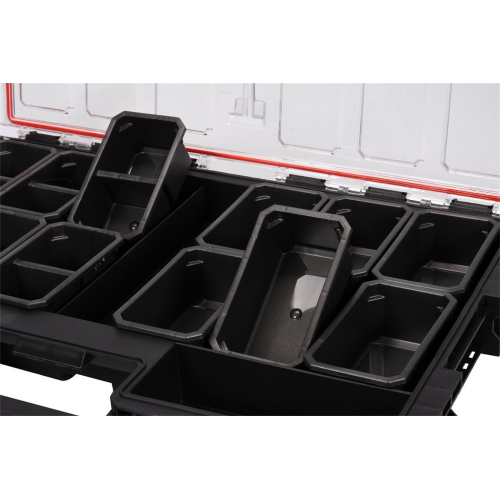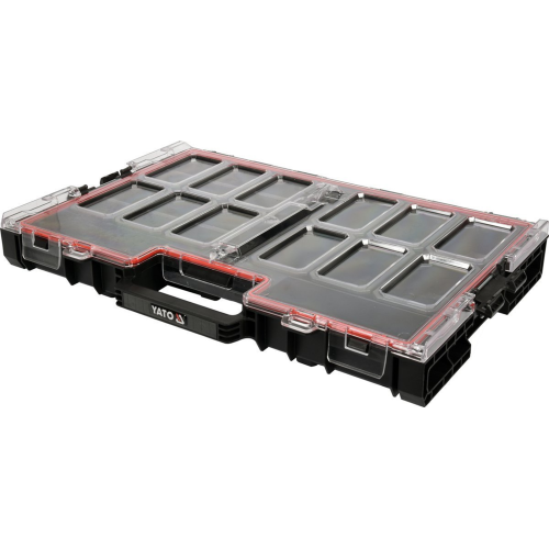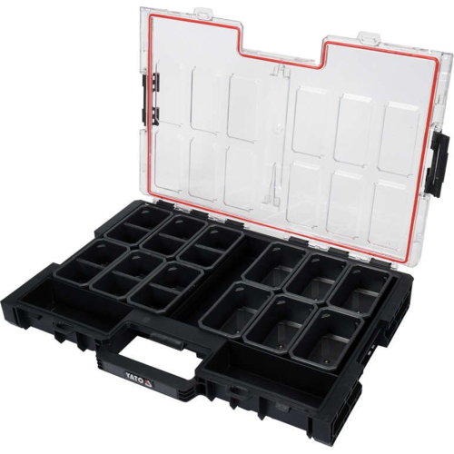 Organizer systemowy L S1 Yato YT-09181 przeznaczony jest do przechowywania i transportu mniejszych akcesoriów w wygodny sposób. 12 pojemników umożliwia przechowywanie różnych elementów bez ich przypadkowego mieszania, co usprawnia pracę - ponadto pojemniki są wyjmowane. Dzięki transparentnej pokrywie użytkownik szybko identyfikuje przenoszone elementy. Uszczelka chroni akcesoria przed wilgocią, zwiększając ich żywotność. Wzmocniona konstrukcja pozwala przenosić większe ciężary. Modułowa konstrukcja umożliwia łączenie ze sobą kilku organizerów. Wygodny uchwyt zwiększa komfort przenoszenia.