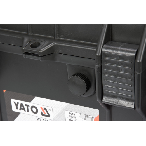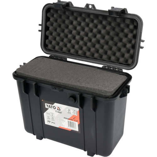 Walizka hermetyczna YT-08907 Yato została wykonana z elastycznego polipropylenu (klasa odporności IP55). Cechują ją: wodoszczelność, pyłoszczelność i odporność na działanie różnych środków chemicznych i korozji. Skrzynia sprawdzi się przy transporcie i przechowywaniu sprzętu, który wymaga specjalnej ochrony przed negatywnym wpływem urazów mechanicznych, wilgoci lub zapylenia. Została wyposażona w gąbkę ze wstępnie naciętymi elementami, które należy usunąć, dopasowując zagłębienia pod konkretne sprzęty, które będzie się w niej przechowywać, np. narzędzia, sprzęt fotograficzny czy sprzęt pomiarowy. Dzięki szczelności i odporności na uszkodzenia mechaniczne, tego rodzaju skrzynia z powodzeniem sprawdzi się w żeglarstwie, sporcie motorowym typu off road itp. Walizkę wyposażono dodatkowo w zawór dekompresyjny umożliwiający wyrównywanie ciśnień podczas transportu lotniczego. Model YT-08907 posiada także miejsce na kłódkę i wygodną rączkę do przenoszenia.