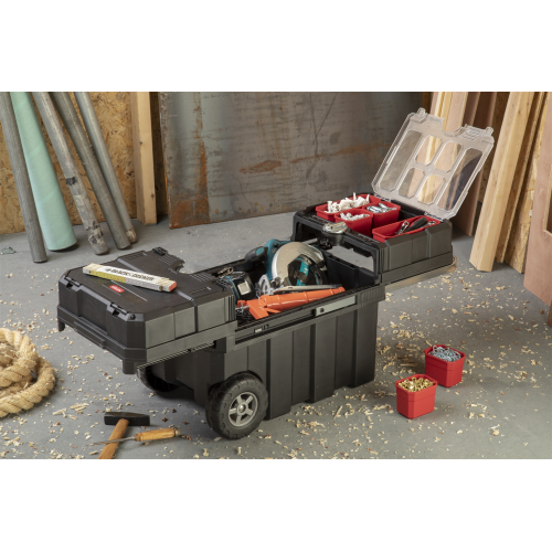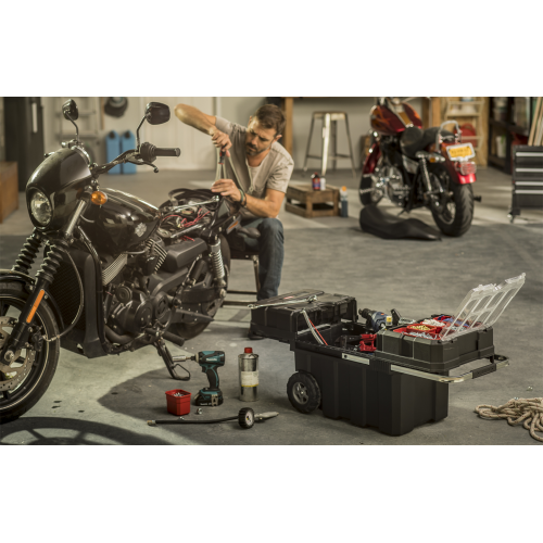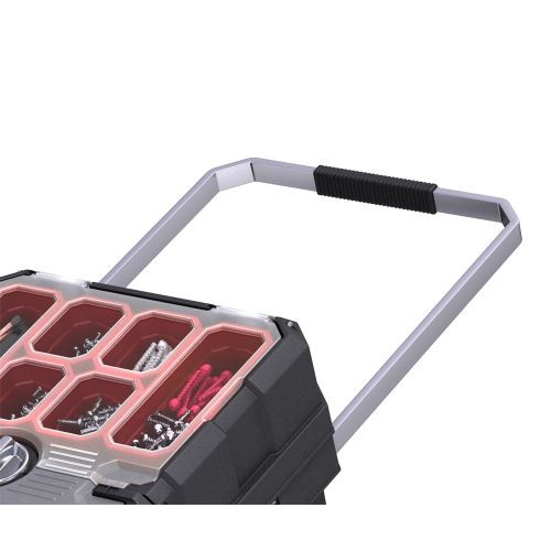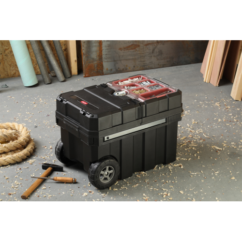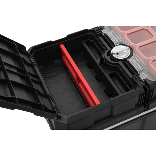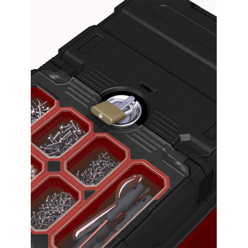 Skrzynka na kółkach Masterloader od renomowanej marki Keter, to świetne rozwiązanie umożliwiające przechowywanie i komfortowe użytkowanie szerokiej gamy sprzętu, narzędzi oraz drobnych akcesoriów. Doskonale sprawdzi się w przypadku profesjonalistów, ale jest równie przydatna w każdym domu. Produkt ten wyposażony został w zintegrowany organizer, liczne pojemniki i regulowane przegródki, co umożliwia grupowanie zawartości oraz sprawniejszą realizację pracy. W skrzynce zastosowano rozsuwany mechanizm z łożyskami kulkowymi, pozwalający na przesuwanie górnych elementów w poziomie. Daje to niemal natychmiastowy dostęp do potrzebnych narzędzi. Skrzynka na kółkach Masterloader posiada wyciąganą metalową rączkę z miękkim uchwytem, która w połączeniu z solidnymi kołami, zapewnia łatwy i wygodny transport. Zamontowany centralny zamek zwiększa bezpieczeństwo przechowywania akcesoriów do pracy. Produkt wykonano z wysokiej jakości tworzywa sztucznego, co przekłada się na solidną i niezawodną konstrukcję.
