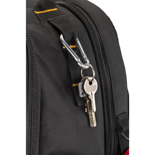 - Dodatkowe zaczepy na miarę zwijaną, metalowy karabińczyk i taśma z przeszyciami umożliwiają szybkie wyszukiwanie i organizowanie niezbędnych przedmiotów.