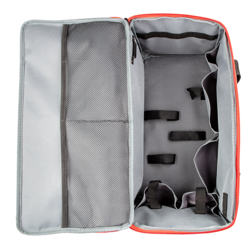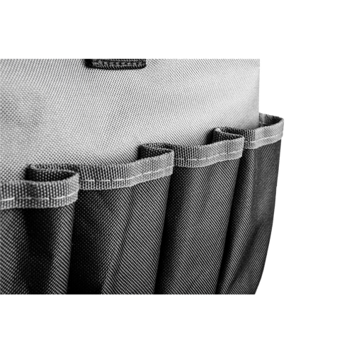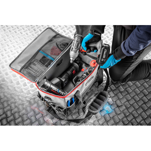 Torba narzędziowa Graphite Energy+ o solidnie wykonanej konstrukcji sprawdzi się przy przenoszeniu i przechowywaniu elektronarzędzi. Torba została wykonana z materiału o gęstym splocie, odpornego na przecieranie. Wnętrze torby jest laminowane, co ma chronić przed wilgocią i i niekorzystnymi warunkami atmosferycznymi. Dzięki licznym kieszeniom (7 wewnętrznych, 14 zewnętrznych) i 14 zaczepom na narzędzia torba pomieści zarówno drobne, jak i duże narzędzia i akcesoria. Torba o wymiarach 50x25x25cm idealnie sprawdzi się przy przenoszeniu czterech elektronarzędzi wraz z osprzętem (akumulatory, ładowarka i dodatkowe akcesoria).