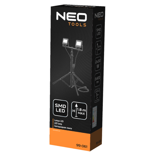 Reflektor podwójny 2x30W SMD LED Neo 99-061 może być używany zarówno na zewnątrz, jak i wewnątrz. Dzięki dwóm lampom o wysokiej mocy reflektor zapewnia dobrą widoczność oświetlanego miejsca. Swoje zastosowanie znajduje przede wszystkim podczas prowadzenia prac budowlanych i remontowych, choć można użyć go także w warsztacie, piwnicy, strychu czy też w studiu fotograficznym. Teleskopowy statyw umożliwia regulowanie wysokości, co zwiększa zakres zastosowań i pozwala dostosować ten parametr do potrzeb użytkownika. Możliwość ustawienia lamp pod kątem sprawia, że obsługujący może dokładnie oświetlić wybrane miejsce. Solidna konstrukcja ze stopniem ochrony IP65 cechuje się stabilnością oraz ochroną przed pyłem i wilgocią.
