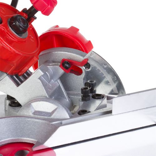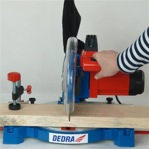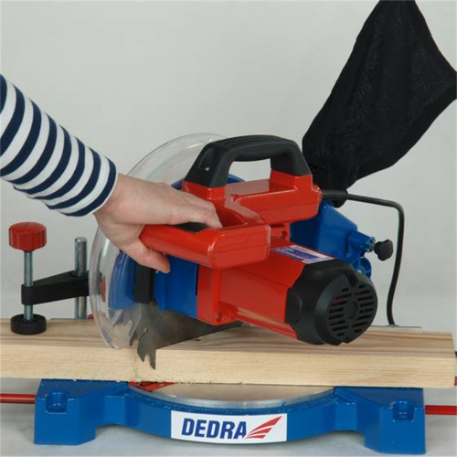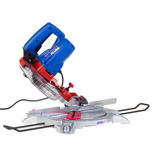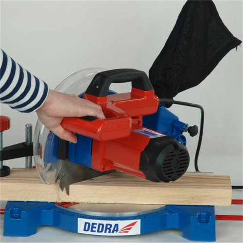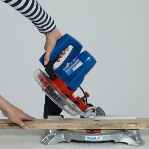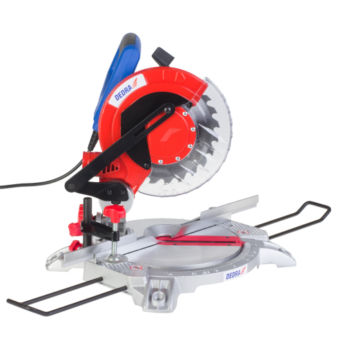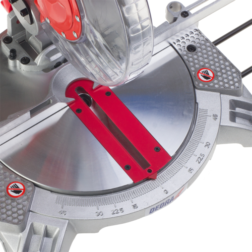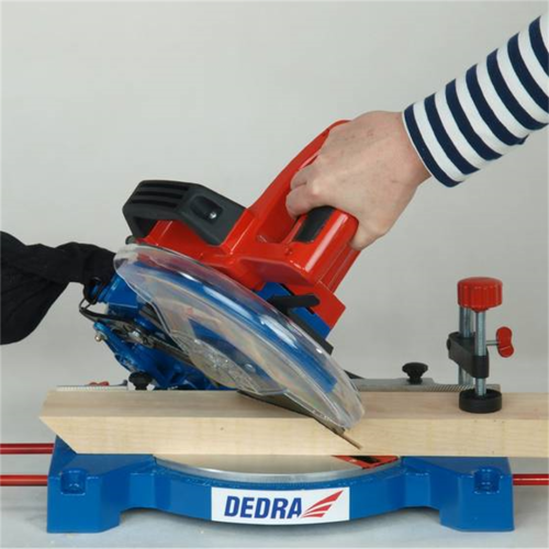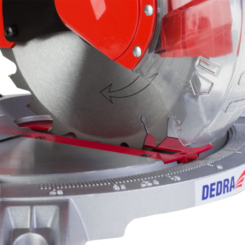 Ukośnica Dedra DED7739 posiada prowadnice boczne, system odprowadzania trocin, przezroczystą osłonę tarczy z automatycznym mechanizmem powrotu, podstawę i stół z wysokiej jakości odlewu aluminium.