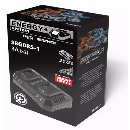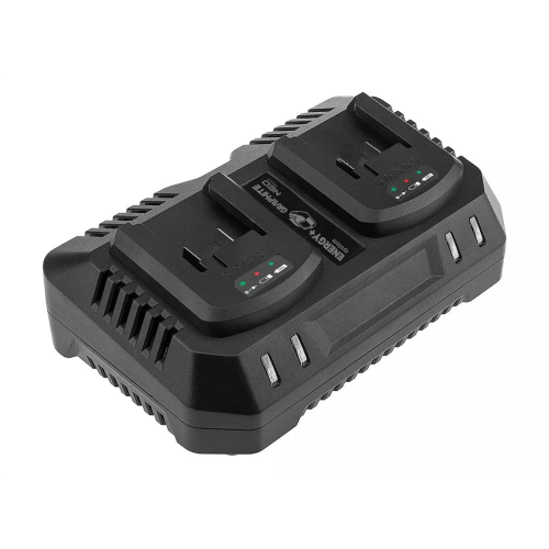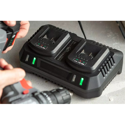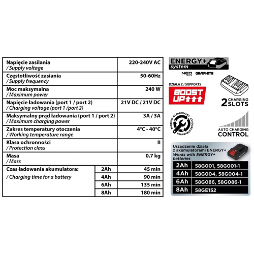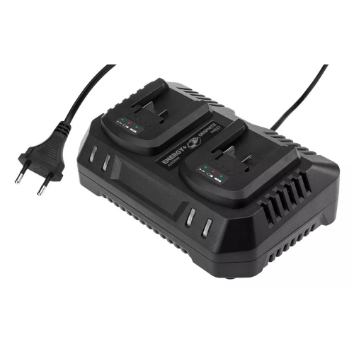Ładowarka 2-portowa Energy+ Graphite 58G085-1 to wysokiej jakości urządzenie, które umożliwia ładowanie jednocześnie dwóch akumulatorów. Produkt jest przeznaczony do baterii litowo-jonowych o napięciu 18 V z serii Energy+. Czas pełnego naładowania wynosi od 45 do 135 minut, w zależności od pojemności baterii.