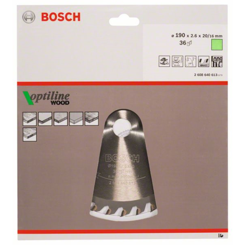 Tarcza pilarska Optiline Wood Bosch 2608640613 to wysokiej jakości osprzęt przeznaczony do cięcia drewna i materiałów drewnopochodnych. Jest przeznaczona do stosowania z ręcznymi pilarkami tarczowymi.