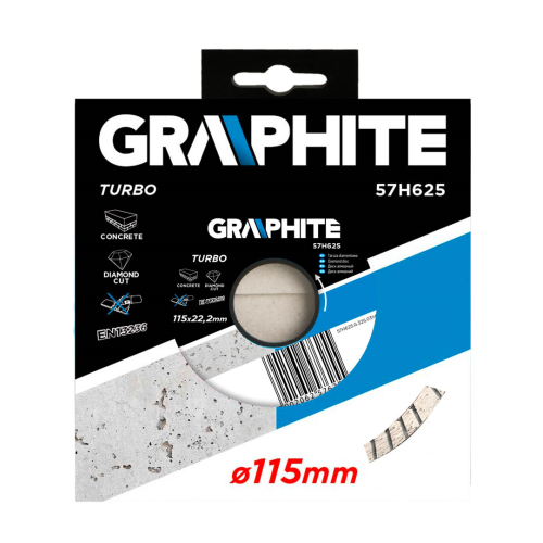 Tarcza diamentowa turbo GRAPHITE (nr ref. 57H625) o średnicy zewnętrznej 115mm, dzięki prasowanym na gorąco segmentom typu TURBO idealnie nadaje się do ciężkich prac budowlanych. Wysoko wytrzymałe segmenty diamentowe pozwalają wydajnie ciąć elementy wykonane z betonu, betonu zbrojonego, granitu, marmuru, kamienia, cegły itp.