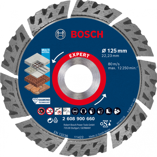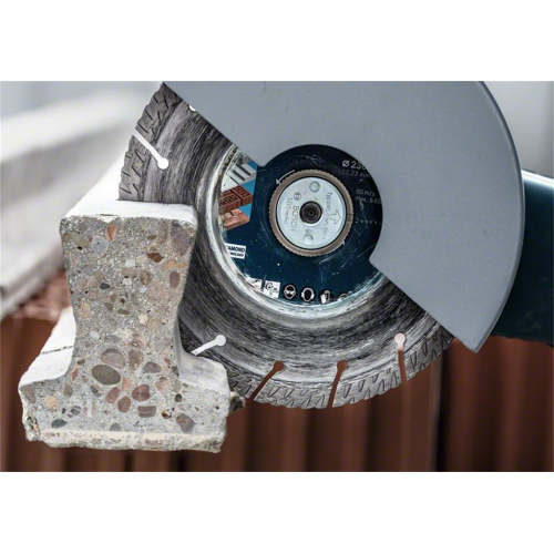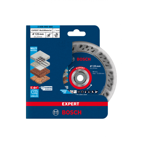 Tarcza tnąca EXPERT MultiMaterial Bosch 2608900660 wytrzymuje do 4 razy dłużej niż diamentowe tarcze do wielu materiałów Bosch 2608615028. Na nowoczesnych placach budowy trzeba ciąć szeroką gamę twardych materiałów, co odbija się na narzędziach. Tarcza tnąca EXPERT MultiMaterial to idealne akcesorium dla zapracowanych specjalistów branży budowlanej, którzy chcą ciąć beton, cegłę, dachówki i beton zbrojony, ponieważ wykonuje swoją pracę przez dłuższy czas. Wysokie segmenty tej tarczy tnącej są wykonane z zaawansowanej matrycy z metalu i diamentów, która została zaprojektowana tak, aby była ostra jak brzytwa. Segmenty te są spawane laserowo na korpusie z twardej stali, a boki są rowkowane, aby usuwać urobek, co zapewnia wydajność i trwałość. Ta mieszanka optymalnych ziaren diamentowych i zaawansowanej konstrukcji oznacza, że diamentowa tarcza tnąca Bosch EXPERT MultiMaterial zapewnia niezrównaną trwałość. Tnie niezawodnie przez czas dłuższy niż inne tarcze diamentowe, nawet Bosch, co ostatecznie zapewnia doskonałą wyddajność. Z otworem 22,23 mm do standardowych szlifierek kątowych z nakrętką zabezpieczającą.
