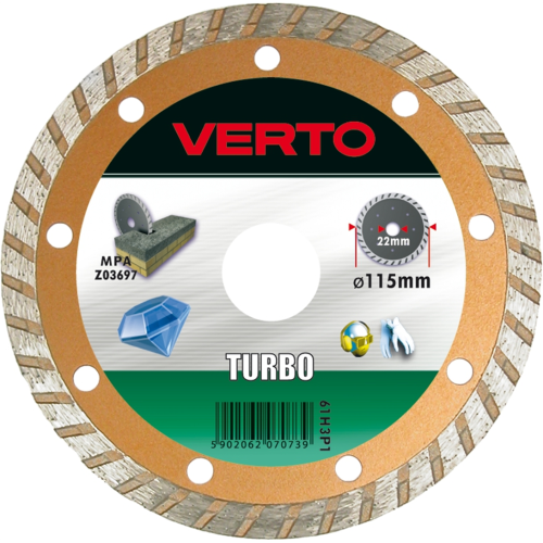 Tarcza diamentowa turbo VERTO (nr ref. 61H3P8) o średnicy zewnętrznej 180mm pozwala wydajnie ciąć elementy wykonane z betonu, betonu zbrojonego, granitu, marmuru, kamienia, cegły itp. Marka VERTO oferuje asortyment elektronarzędzi i akcesoriów dla każdego majsterkowicza.