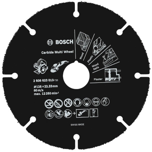 Tarcza tnąca Multi Wheel Bosch to osprzęt wielozadaniowy przeznaczony do cięcia drewna, drewna z gwoździami, tworzyw sztucznych, a także gipsu. Sprawdzi się przy cięciu palet, rurek, płytek, a nawet paneli podłogowych. Jest przystosowana do pracy z szlifierką kątową.