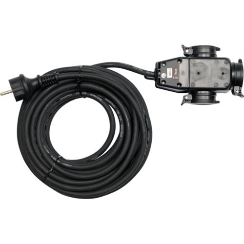 Przedłużacz z trzema gniazdami w gumowej osłonie z rozdzielaczem.