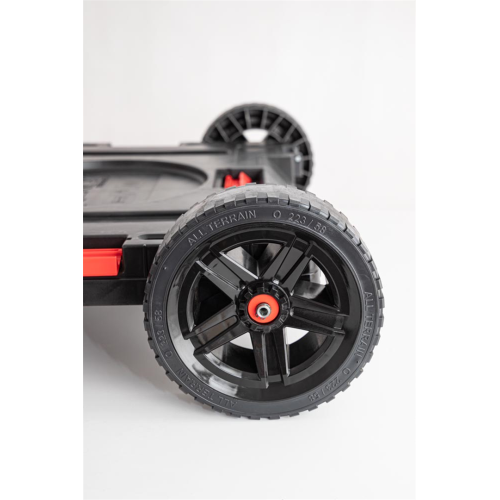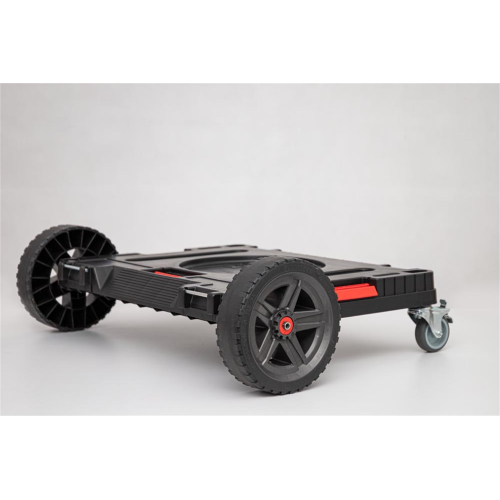 Wyjątkowość tego produktu polega również na zastosowaniu super wytrzymałego tworzywa RED Ultra HD w czarnym wydaniu. Producent chcąc zaoferować produkt, którego trwałość będzie niepodważalna i adekwatna do zastosowania produktów Qbrick ONE użył najlepszych znanych sobie materiałów, dając gwarancje nośności na poziomie 120kg. Ponadto oś stalowa, solidne koła z grubą warstwą gumy i poliamidowe zapięcia dotrzymują kroku w niezawodności kompozytu znanego z linii RED. Podwozie pokryte gęstą siecią grubych żeber zapewni dużą sztywność i solidne podłoże dla newralgicznych elementów jak koła. Te mocowane są dużą śrubą zapartą o tworzywo na długim odcinku.
