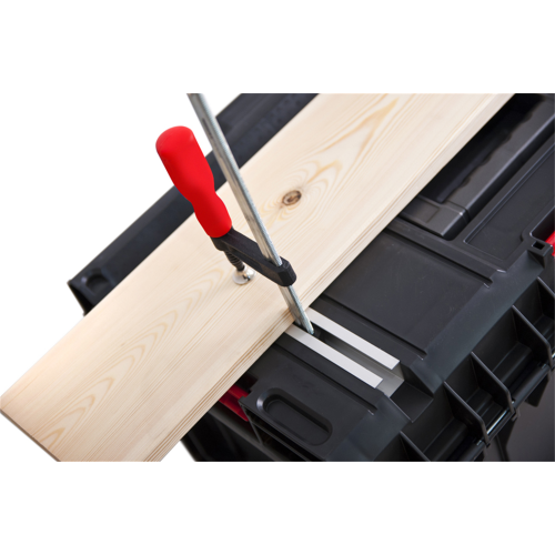 • Pokrywa z szynami do mocowania zacisków stolarskich – znakomite rozwiązanie pozwalające używać walizki jako podręcznego stołu warsztatowego z przymiarem i zaciskami do przytrzymywania materiałów lub imadła
