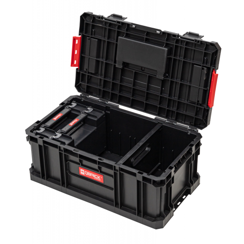 Z komory skrzyni można korzystać na kilka sposobów. Użytkownik ma bowiem do dyspozycji wyjmowaną przegrodę oraz dwa wyjmowane organizery Multi, które może dowolnie umieszczać w skrzyni lub całkiem wyjąć, jeśli potrzebuje maksymalnie dużej przestrzeni do przechowywania. Każdy z organizerów jest również wyposażony w wyjmowane przegródki, dzięki czemu bez problemu można posegregować drobny osprzęt i w razie potrzeby zabrać cały zestaw na miejsce pracy.