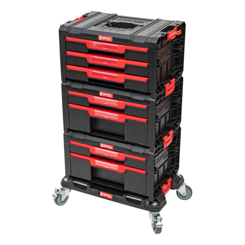 - Kompletny, mobilny, solidny i praktyczny zestaw trzech skrzynek narzędziowych z szufladami do przechowywania drobnych narzędzi i akcesoriów