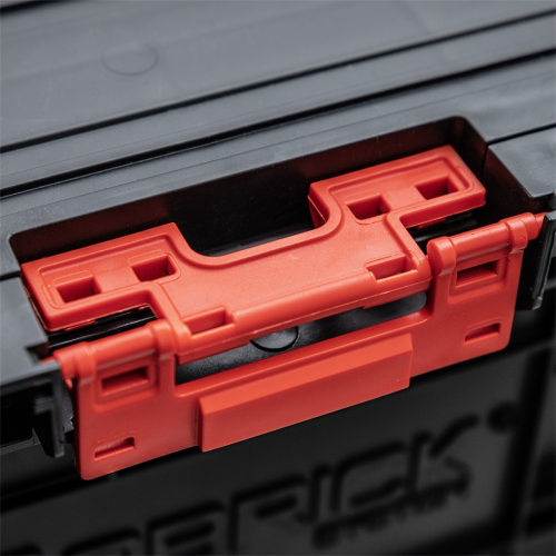 - Konektory boczne – innowacyjne zaczepy poliamidowe do bardzo trwałego łączenia ze sobą skrzynek z linii PRO o tym samym wymiarze pozwalają na transportowanie kilku skrzyń jednocześnie