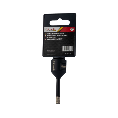 Otwornica diamentowa z uchwytem SOD-M14/6 Schmith do stosowania na sucho. Zastosowany gwint M14 pozwala na pracę z wykorzystaniem szlifierki kątowej. Otwornice z nasypem diamentowym pozwalają wiercić w gresie, gresie szkliwionym, glazurze, betonie, kamieniu, granicie, marmurze, cegle, asfalcie, szkle ceramicznym, laminacie, PCV i metalach nieżelaznych.