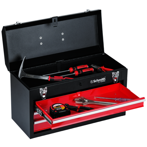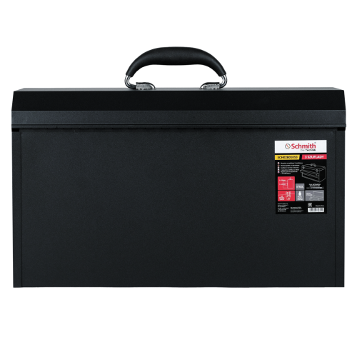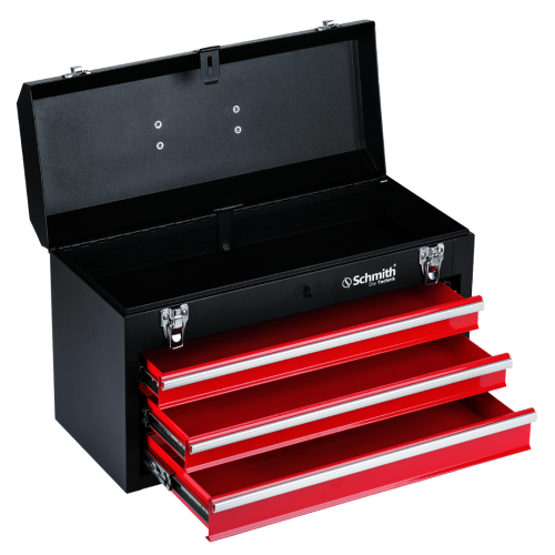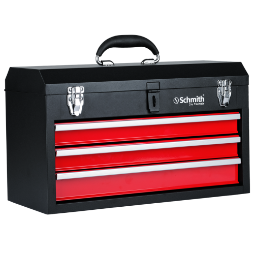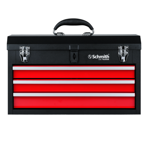 Skrzynka narzędziowa z 3 szufladami Schmith SCH02B01010 to praktyczne rozwiązanie do przechowywania i przenoszenia narzędzi. Doskonale sprawdza się w warsztacie i przy mobilnej pracy. Konstrukcja wykonana ze stali SPCC zapewnia jej trwałość, odporność na uszkodzenia i nośność aż do 50 kg. Zamocowana na górnej pokrywie wygodna rączka ułatwia przenoszenie skrzynki. Ponadto dwa metalowe zamki boczne gwarantują pewne zamknięcie, a rygiel na kłódkę umożliwia zabezpieczenie dostępu do jej zawartości przed niepowołanymi osobami. 3 szuflady pozwalają na uporządkowane przechowywanie narzędzi o różnych rozmiarach. Prowadnice szuflad posiadają łożyska kulkowe, dzięki czemu wysuwają się płynnie i cicho. Waga pustej skrzynki to 8,7 kg.