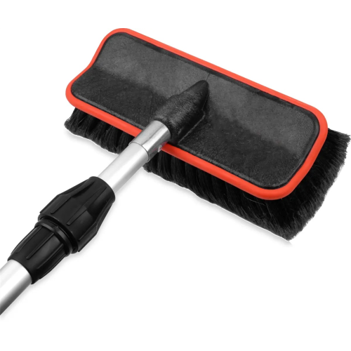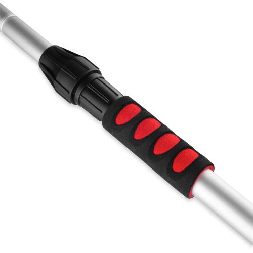 Szczotka ma solidny i jednocześnie lekki aluminiowy trzonek oraz piankowe uchwyty, które zwiększają wygodę trzymania, a także manewrowania, co ma szczególne znaczenie przy pracy z uniesionymi rękami. Jej końcówka robocza z miękkimi włóknami nie rysuje powierzchni, dzięki czemu nadaje się do czyszczenia delikatnych paneli fotowoltaicznych czy karoserii.
