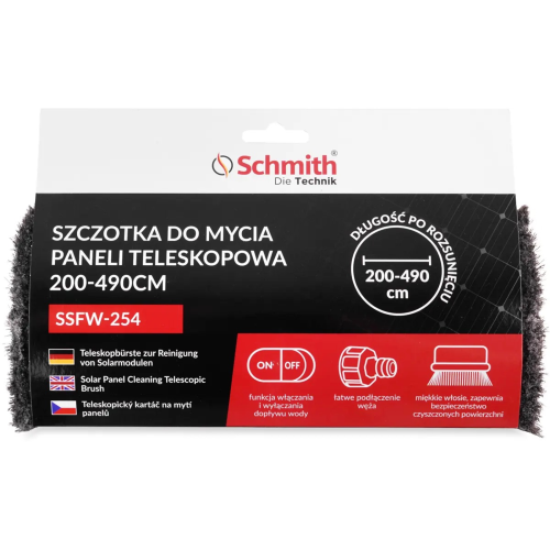 SSFW-254 Schmith to uniwersalna szczotka do mycia paneli fotowoltaicznych, a także aut, przyczep kempingowych i ciężarówek. Dzięki teleskopowej konstrukcji (długość trzonka 200-490 cm) ułatwia dotarcie do trudno dostępnych miejsc.