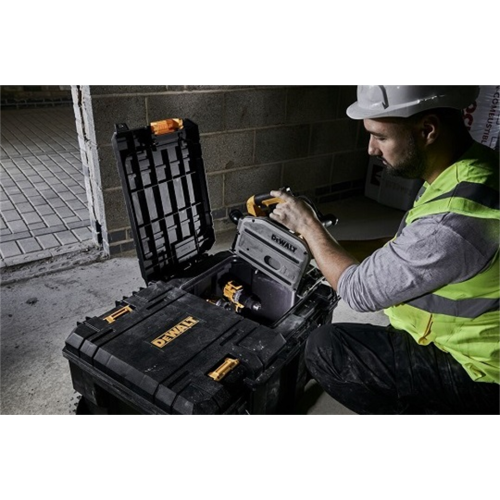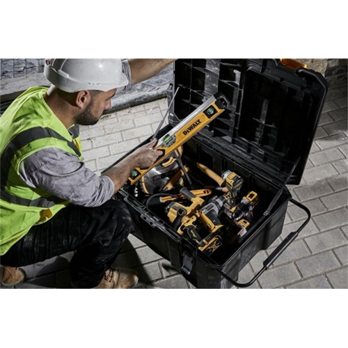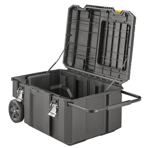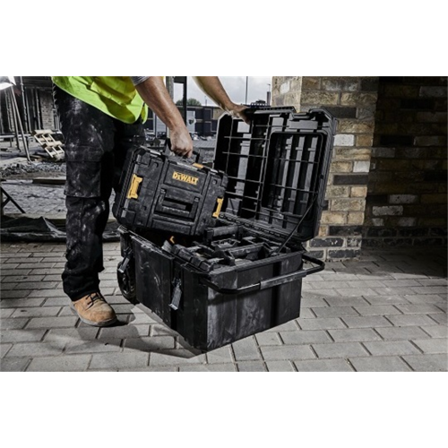 Skrzynia na kołach jest częścią systemu TSTAK DeWalt, który umożliwia łączenie różnych modułów w jedną spójną konstrukcję, zapewniającą wygodę i porządek podczas pracy. Co istotne, dzięki funkcji szybkiego dostępu istnieje możliwość otwarcia tylko połowy pokrywy kufra, co pozwala na łatwe dotarcie do przechowywanych narzędzi, nawet gdy skrzynie TSTAK są ze sobą połączone.