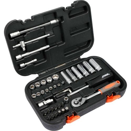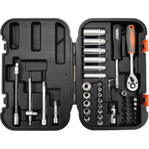 Zestaw narzędziowy XS 1/4" 42szt. Sthor 58641 zawiera elementy wykonane z wysokiej jakości materiałów, co świadczy o ich wytrzymałości. Komplet przydaje się do drobnych pracach montażowych, napraw mechanicznych, a także przy różnego rodzaju działaniach w domu i w warsztacie. Całość w wygodnej walizce.