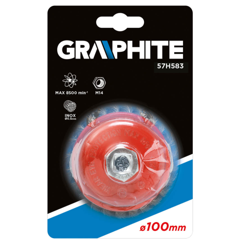 Szczotka druciana GRAPHITE (nr ref. 57H583) o średnicy 100mm, wykonana z drutu ze stali nierdzewnej o grubości 0.5mm. Wzmocniona konstrukcja korpusu pozwala na wydajne czyszczenie konstrukcji stalowych ze stali nierdzewnej i stali kwasoodpornej. Mocowanie przystosowane do współpracy ze szlifierkami kątowymi.