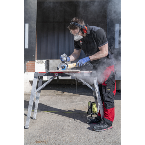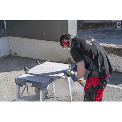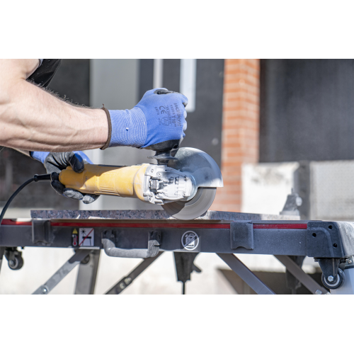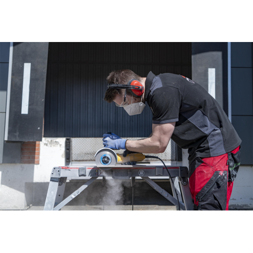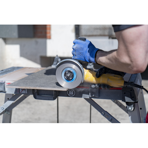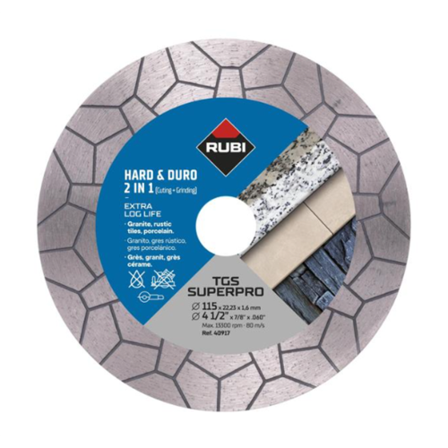 Tarcza diamentowa Rubi TGS 115 SUPERPRO 40917 została stworzona z myślą o skutecznej obróbce twardych materiałów takich jak granit, klinkier, łupek, gres porcelanowy i rustykalny czy konglomeraty kwarcowe. Występuje w klasie SUPERPRO wyróżniającej się zwiększoną wydajnością. Jest przeznaczona do cięcia oraz szlifowania na sucho. Pasuje do szlifierek kątowych 115mm. Diamentowe obrzeże tarczy zostało wykonane ze specjalnego stopu, który oferuje wysoką żywotność oraz prędkość cięcia sięgającą 12250 obr./min. Średnica zewnętrzna wynosi 115 mm i pozwala na wygodną i precyzyjną pracę, w tym na cięcie pod kątem 45º.