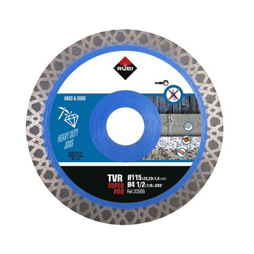 Tarcza diamentowa TURBO VIPER - TVR SUPERPRO Rubi 30986 to profesjonalny osprzęt do przecinania na sucho granitu, rustykalnych płytek kamiennych, materiałów ogniotrwałych, łupków i gresu porcelanowego. Tarcza TVR z obrzeżem diamentowym, spawanym laserowo cechuje się wysoką jakością wykonania i bezpieczeństwem użytkowania. Dzięki przeplatanej konstrukcji obrzeża (Turbo połączone z nasypem ciągłym) odznacza się szybkością oraz precyzją cięcia. Dzięki centralnemu wzmocnieniu dysku jest bardziej odporna na zginanie. Tarcza jest polecana do najbardziej wymagających zastosowań.