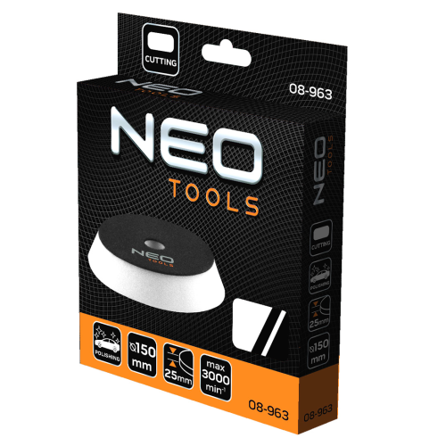 Pad polerski Neo 08-963 o średnicy 150 mm i grubości gąbki 25 mm, mocowany na rzep o średnicy 130 mm. Wykonany z pianki poliuretanowej. Przeznaczony do pracy z polerkami. Przeznaczony do agresywnego polerowania. Zalecany do pracy z maksymalną prędkością 3000 obrotów na minutę. Dzięki mocnemu połączeniu z uchwytem na rzep 08-968 produkt zyskuje większą wydajność pracy.