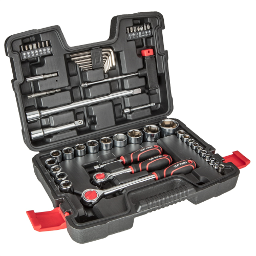Zestaw kluczy nasadowych Top Tools 38D530 to 53-elementowy zestaw narzędzi do prac warsztatowych. W zestawie znajdują się m.in. nasadki sześciokątne w dwóch rozmiarach (1/2" i 1/4"), grzechotki, klucze sześciokątne typu imbus, końcówki wkrętakowe oraz wiele innych akcesoriów usprawniających pracę każdego majsterkowicza.