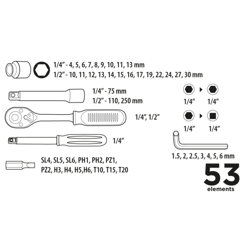 Wyposażenie podstawowe:- 13 nasadek sześciokątnych 1/2": 10, 11, 12, 13, 14, 15, 16, 17, 19, 22, 24, 27, 30mm
