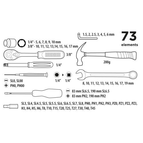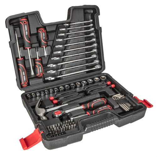 Zestaw narzędziowy Top Tools 38D500 to uniwersalny zestaw do różnego rodzaju prac montażowych i naprawczych w domu, garażu i warsztacie każdego majsterkowicza. Zestaw składa się z 73 elementów i obejmuje m.in. sześciokątne nasadki w rozmiarze 3/8" i 1/4", klucze oczkowo-płaskie, klucze sześciokątne, końcówki wkrętakowe, grzechotkę, młotek oraz wiele innych akcesoriów usprawniających prace.