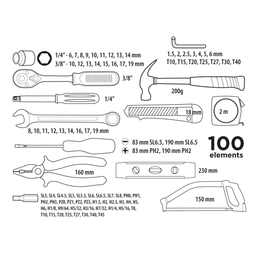 Zestaw narzędziowy 100szt. Top Tools 38D535 umożliwia wykonywanie drobnych prac domowych. Dostępne w komplecie elementy sprawiają, że operator jest w stanie wykonywać wiele różnego rodzaju zadań. Całość dostarczana jest w wygodnej walizce zwiększającej komfort przenoszenia i przechowywania.