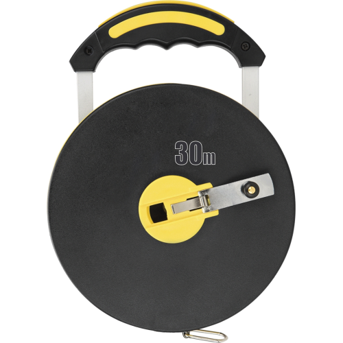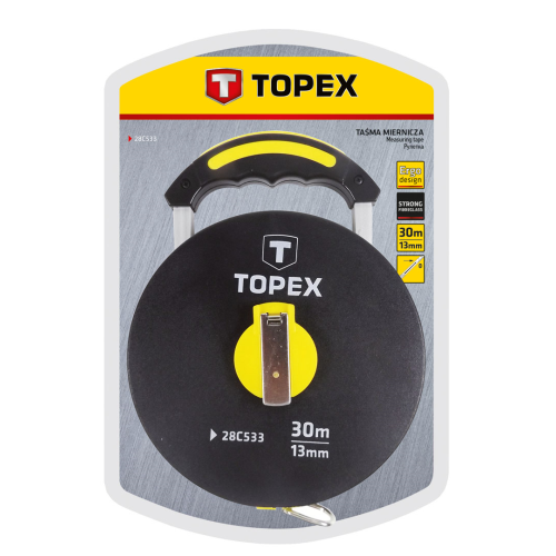 Taśma miernicza TOPEX (nr ref. 28C533) o długości 30m z przesuniętym punktem „0”. Taśma wykonana z wytrzymałego włókna szklanego. Obudowa z mocnego tworzywa sztucznego. Zaczep końcowy pozwala na zamocowanie końca taśmy, co ułatwia dokonanie pomiaru. Wysuwana rączka pozwala na odpowiednie ustawienie taśmy podczas pracy. Marka TOPEX skierowana jest do majsterkowiczów.