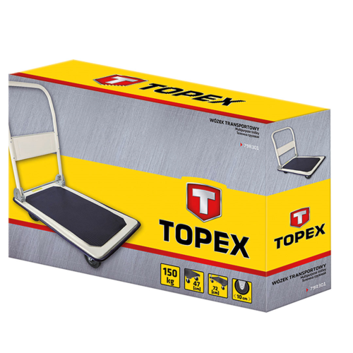 Wózek transportowy TOPEX (nr ref. 79R301) o wymiarach 72x47x82cm, masa 8.9kg. Solidny wózek transportowy, wykonany z profili stalowych o nośności do 150kg. Posiada podstawę pokrytą antypoślizgowym tworzywem. Wózek wyposażony jest w samonastawne tylne koła, co ułatwia manewrowanie w ciasnych pomieszczeniach. Marka TOPEX skierowana jest do majsterkowiczów.