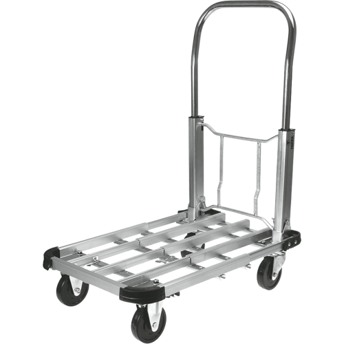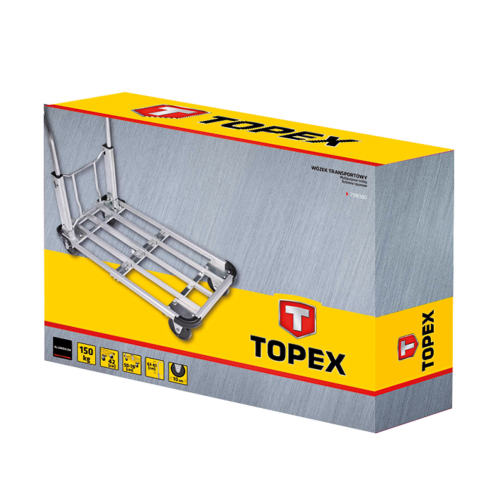 Wózek transportowy składany TOPEX (nr ref. 79R300) o wymiarach 70x42cm. Lekki i praktyczny wózek transportowy o nośności do 150kg. Wykonany z wytrzymałych profili aluminiowych, posiada regulację wysokości uchwytu w zakresie 50-70cm. Wózek wyposażony jest w solidne koła oraz odbojniki z tworzywa sztucznego. Dzięki możliwości składania jest poręczny w transporcie. Masa wózka 7.5kg. Marka TOPEX skierowana jest do majsterkowiczów.