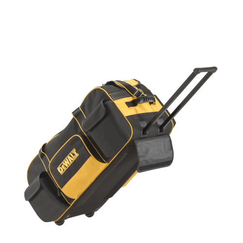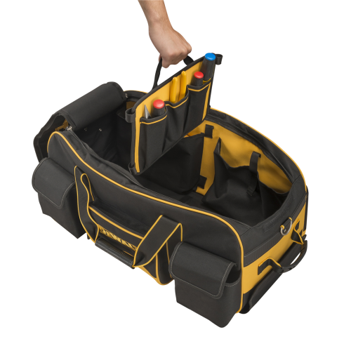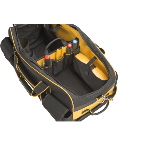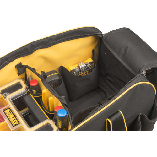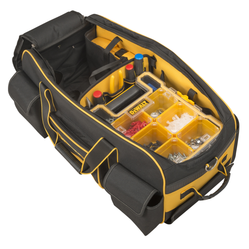 Narzędziowa torba materiałowa DWST1-79210 DeWALT charakteryzuje dużą pojemnością, mobilnością i sporymi możliwościami zorganizowania wnętrza. Torba narzędziowa może być transportowana na długim pasku na ramieniu, za dwie rączki lub ciągnięta na kołach za krótką rączkę elastyczną albo teleskopową, sztywną rękojeść dolną. Kompozytowe wzmocnienia podłogi chronią zawartość przed uderzeniami o podłoże i ułatwiają transportowanie na kołach. Zewnętrze kieszenie sprawdzą się na akcesoria szybkiego dostępu, takie jak zestawy wierteł i bitów lub zapasowe akumulatory. Pojemne wnętrze dysponuje wyjmowaną przegrodą z kaburami na mniejsze narzędzia ręczne i osprzęt. Przegroda może oddzielać elektronarzędzia, zwiększając ład i porządek. Górna pokrywa może całkowicie odsłonić wnętrze, dając nieograniczony dostęp do zawartości. Torba narzędziowa to niezła alternatywa dla walizek i skrzyni narzędziowych.