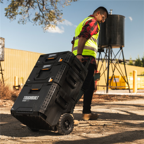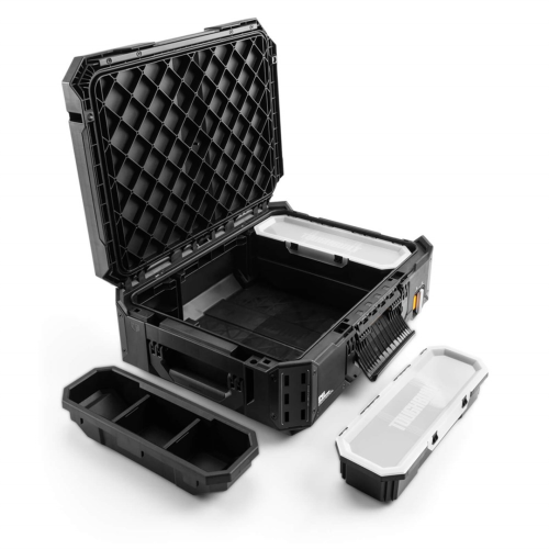 Komplet składa się z trzech modułów o różnej pojemności. Do dyspozycji są także wyjmowane pojemniczki i tacki narzędziowe. Tak więc jest wiele możliwości zorganizowania swoich narzędzi, a producent oferuje także kompatybilne organizery i szuflady. Jeszcze więcej opcji zagospodarowywania systemu skrzyń stwarzają wzmocnione narożniki z perforacją przystosowaną do akcesoriów od ToughBuilt. Szeroka gama systemowych elementów naskrzynkowych umożliwia odwieszanie narzędzi na zewnątrz kufra, a także customizację, czyli samodzielne modyfikacje wedle własnych potrzeb. Należy także docenić wysoki standard wykonania w postaci solidnego ożebrowania, metalowych wzmocnień pokrywy, miejsc na kłódki czy samej ramy wózka z demontowaną rękojeścią teleskopową. Również porządnie pogumowane koła stanowią niezawodny element tego mobilnego warsztatu, pozwalając przemieszczać się ciężkim zestawem w trudnym terenie i pokonywać wysokie stopnie.