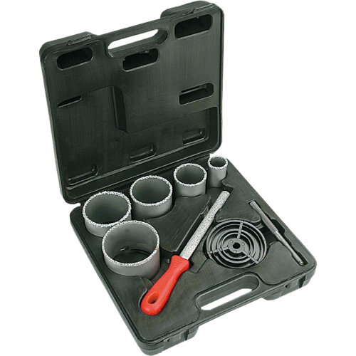 Otwornice z nasypem z węglika wolframu VERTO (nr ref. 60H900), zestaw 5szt. o rozmiarach od 32 do 83mm, pozwalających na wiercenie otworów w betonie, cegłach, glazurze. Plastikowa kaseta pozwala na wygodne przechowywanie zestawu. Dodatkowy element zestawu, pilnik z nasypem z węglika wolframu, pozwala na ręczne dopracowanie wierconych powierzchni. Marka VERTO oferuje asortyment elektronarzędzi i akcesoriów dla każdego majsterkowicza.