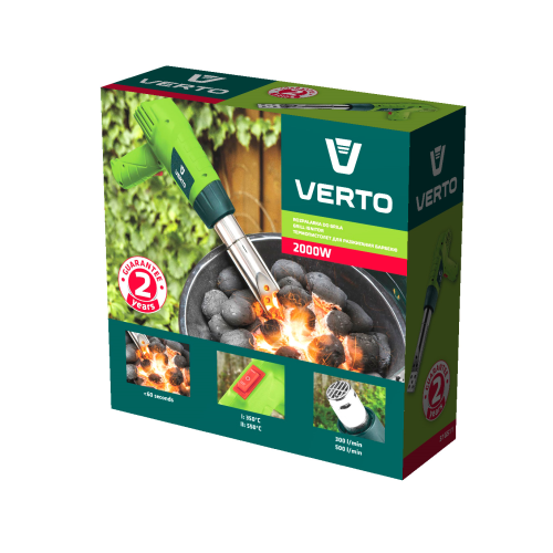 Rozpalarka do grilla 2000W VERTO będąca połączeniem opalarki i specjalistycznej dyszy pozwala na szybkie rozpalenie grilla węglowego. Zastosowanie rozpalarki eliminuje konieczność użycia chemicznych rozpałek płynnych lub stałych, przez co przyrządzane potrawy są zdrowsze i smaczniejsze. Odpowiednio dobrane parametry oraz specjalny kształt dyszy pozwalają na rozpalenie grilla w zaledwie 60 sekund. Produkt przeznaczony dla osób ceniących ekologię oraz szukających czystego i łatwego sposobu na rozpalenie grilla. Poza sezonem grillowym urządzenie może służyć jako standardowa opalarka. Marka VERTO skierowana jest do majsterkowiczów.