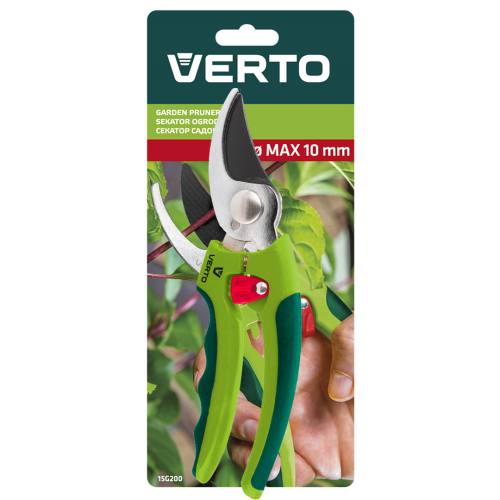 Sekator ogrodowy uniwersalny VERTO (nr ref. 15G200) o długości 185 mm i średnicy cięcia do 10 mm. Sekator typu by-pass, przeznaczony do cięcia kwiatów i krzewów. Ostrze o długości 42 mm pokryte powłoką teflonową, zapewniającą ochronę przed korozją. Blokada ostrza uniemożliwia otwieranie w niepożądanych momentach. Ergonomiczny uchwyt z tworzywa sztucznego pokryty antypoślizgowym materiałem zapewnia bezpieczeństwo i komfort podczas pracy. Wąski rozstaw uchwytów sprawia, że narzędzie jest dostosowane również do kobiecej dłoni.