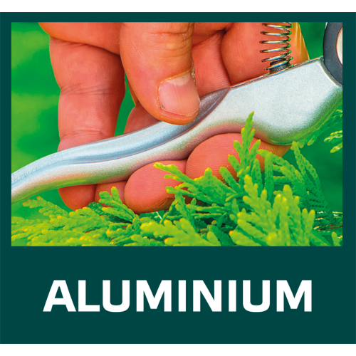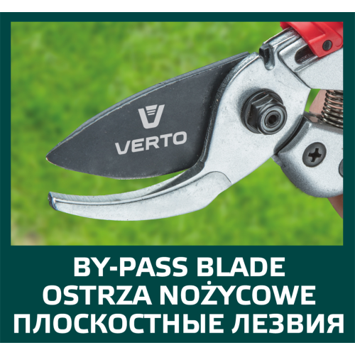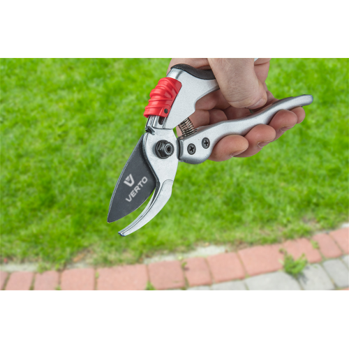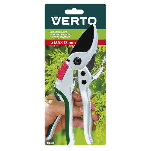Sekator ogrodowy uniwersalny aluminiowy VERTO (nr ref. 15G206) o długości 195 mm i średnicy cięcia do 18 mm. Sekator typu by-pass, przeznaczony do cięcia gałęzi i krzewów. Ergonomiczne odgięcie ostrzy o 15° znacznie ułatwia pracę oraz podnosi jej komfort. Ostrze pokryte powłoką teflonową, zapewniającą ochronę przed korozją. Aluminiowy korpus gwarantuje trwałość narzędzia. Blokada ostrza uniemożliwia otwieranie w niepożądanych momentach. Ergonomiczny uchwyt z tworzywa sztucznego pokryty antypoślizgowym materiałem zapewnia bezpieczeństwo i komfort podczas pracy.