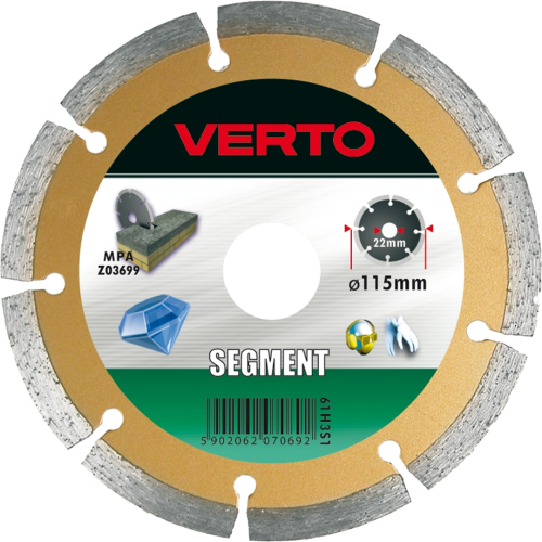 Tarcza diamentowa segmentowa VERTO (nr ref. 61H3S8) o średnicy zewnętrznej 180mm pozwala wydajnie ciąć elementy wykonane z betonu, betonu zbrojonego, granitu, marmuru, kamienia, cegły itp. Marka VERTO oferuje asortyment elektronarzędzi i akcesoriów dla każdego majsterkowicza.