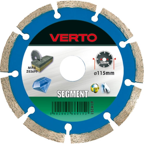 Tarcza diamentowa segmentowa VERTO (nr ref. 61H2S9) o średnicy zewnętrznej 230mm pozwala wydajnie ciąć elementy wykonane z betonu, betonu zbrojonego, granitu, marmuru, kamienia, cegły itp. Marka VERTO oferuje asortyment elektronarzędzi i akcesoriów dla każdego majsterkowicza.
